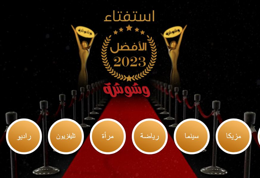 ويتضمن استفتاء وشوشة 2023 التصويت على الأفضل في المجالات التالية:( الدراما- الموسيقى- السينما- الرياضة- المرأة- التلفزيون- الراديو- صناع المحتوى).