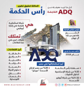 ونشرت مؤسسة “ماعت جروب” انفوجراف، عن الشركة القابضة الإماراتية (ADQ)، والتي يرأس مجلس إدارتها الشيخ طحنون بن زايد آل نهيان.