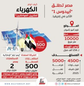 واستعرض إنفوجراف لمؤسسة “ماعت جروب” ميزات محطة أبيدوس، حيث تقع أبيدوس للطاقة الشمسية في منطقة كوم أمبو بمحافظة أسوان جنوب مصر. تعتبر أسوان من أبرز المناطق في العالم التي تتمتع بوفرة في الطاقة الشمسية، نظرًا لسطوع الشمس فيها طوال العام.