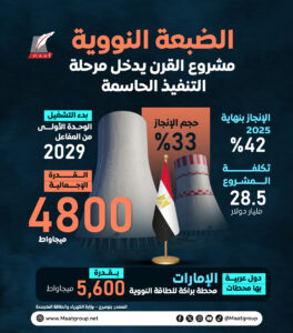ووفق إنفوجراف لمؤسسة “ماعت جروب” تستهدف مصر رفع نسبة الإنجاز في أعمال بناء المحطة إلى 42% بنهاية العام الجاري، مع بدء تشغيل الوحدة الأولى للمفاعل النووي في عام 2029.