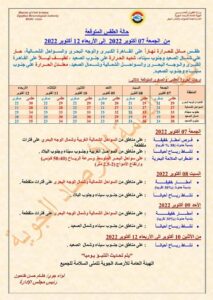 وأوضحت هيئة الأرصاد، في بيان لها، أنه من المتوقع سقوط أمطار خفيفة على مناطق من السواحل الشمالية الغربية وشمال الوجه البحري على فترات متقطعة ونشاط رياح أحيانًا على مناطق من السواحل الغربية وجنوب سيناء وجنوب البلاد، وذلك يوم الجمعة.