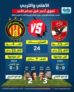 وتشير لغة الأرقام إلى تفوق كبير لصالح الأهلي في مواجهاته أمام الترجي، حيث التقيا في 24 مباراة سابقة، تمكن المارد الأحمر من الفوز في 13، مقابل 4 للفريق التونسي، وحسم التعادل 7 مواجهات، وسجل لاعبو الأهلي 31 هدفًا، مقابل 15 هدفًا للترجي، وفق إنفوجراف لشبكة رؤية الإخبارية.