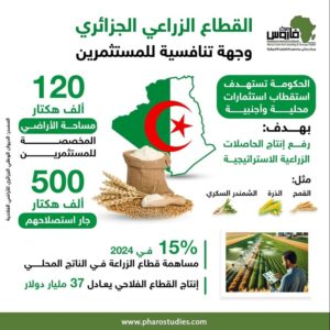 تعمل الجزائر على استقطاب استثمارات محلية وأجنبية لرفع إنتاج البلاد من الحاصلات الزراعية الاستراتيجية،كالقمح والذرة والشمندر السكري.