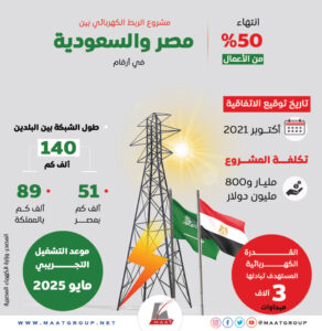 ونشرت مؤسسة “ماعت جروب” إنفوجراف يكشف بعض الأرقام في مشروع الربط الكهربائي، والذي وقعت البلدان اتفاقا بشانه في عام 2012.