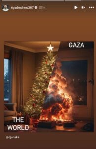 رداً علي احتفالات الكريسماس، تضامن النجم رياض محرز قائد منتخب الجزائر ولاعب فريق أهلي جدة السعودي مع أهل قطاع غزة بنشر صورة عبر في استوري عبر حسابه الشخصي “انستجرام” يرفع فيها علم دولة فلسطين.