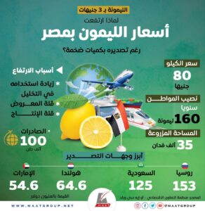 وأرجع حسين أبوصدام، نقيب الفلاحين، ارتفاع أسعار الليمون البلدي في الأسواق المصرية خلال الأيام القليلة الماضية، حتى وصل سعر الليمونة الواحدة لثلاثة جنيهات، إلى قلة المعروض من الليمون مع كثرة الطلب هو السبب الأساسي في ارتفاع أسعاره مؤخرًا، وفق إنفوجراف لمؤسسة “ماعت جروب”.