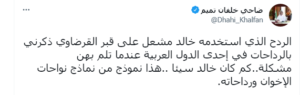 وقال خلفان على صفحته الرسمية بتويتر،: “الردح الذي استخدمه خالد مشعل على قبر القرضاوي ذكرني بالرداحات في إحدى الدول العربية عندما تلم بهن مشكلة.. كم كان خالد سيئا.. هذا نموذج من نماذج نواحات الإخوان ورداحاته”.