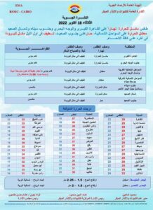 وأوضحت أن البحر المتوسط يشهد أمواجًا معتدلة، وتتراوح بين 1.5 إلى 2.25، أما البحر الأحمر فيكون معتدلا وارتفاع الموج فيه يتراوح بين 1.5 إلى 2 متر، واتجاه الرياح لهما تكون شمالية غربية.