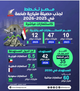 ووفق إنفوجراف لمؤسسة “ماعت جروب” تستهدف القاهرة جذب 42 مليار دولار خلال العام المالي 2025-2026، والوصول إلى 60 مليار دولار بنهاية 2030.
