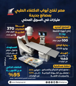 وتستورد مصر 100% من حاجاتها من أجهزة الأشعة، فيما سيوفر المصنع الجديد ما يقدر بـ 40% من احتياجات مصر من أجهزة الأشعة محلياً، والمقدر أن يتم افتتحه في يونيو العام المقبل 2026، وفق إنفوجراف لـ”مؤسسة ماعت جروب”.