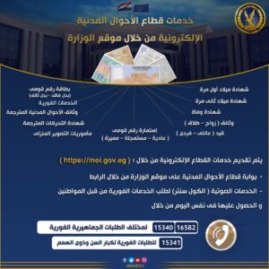 وفي هذا الإطار فقد تم تفعيل العديد من خدمات القطاع الإلكترونية من خلال موقع بوابة وزارة الداخلية على شبكة المعلومات الدولية الإنترنت، من خلال الرابط (https://moi.gov.eg) فضلًا عن تقديم الخدمات الصوتية الكول سنتر، لطلب الخدمات الفورية والحصول عليها فى نفس اليوم من خلال الخط الساخن 15340- 16582.