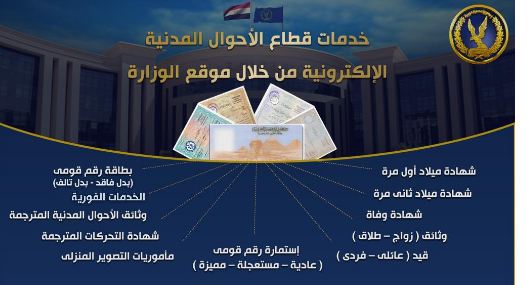 وتشمل الخدمات الجديدة ( شهادة ميلاد أول وثاني مرة- شهادة وفاة- وثائق زواج وطلاق – قيد عائلي – فردى- بطاقة رقم قومي بدل فاقد، بدل تالف استمارة رقم قومي عادية، مستعجلة، مميزة، وثائق الأحوال المدنية المترجمة- شهادة التحركات المترجمة- مأمورية التصوير المنزلي- الخدمات الفورية).