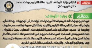 كشف المركز الإعلامى لمجلس الوزراء إنه فى ضوء ما تردد من أنباء بشأن اعتزام وزارة الأوقاف تقييد صلاة التراويح بوقت محدد خلال شهر رمضان، تواصل المركز مع وزارة الأوقاف، والتي نفت تلك الأنباء، مُؤكدةً أنه لا صحة لتقييد صلاة التراويح بوقت محدد خلال شهر رمضان، وأنه لم يتم اتخاذ أي إجراءات أو إصدار أي توجيهات بهذا الشأن.