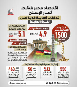 ويبلغ عدد الشركات الألمانية العاملة في مصر حاليا أكثر من 1500 شركة باستثمارات تبلغ نحو 4.9 مليار دولار، فيما بلغ حجم التبادل التجاري بين البلدين في عام 2025 نحو 5.1 مليار دولار.